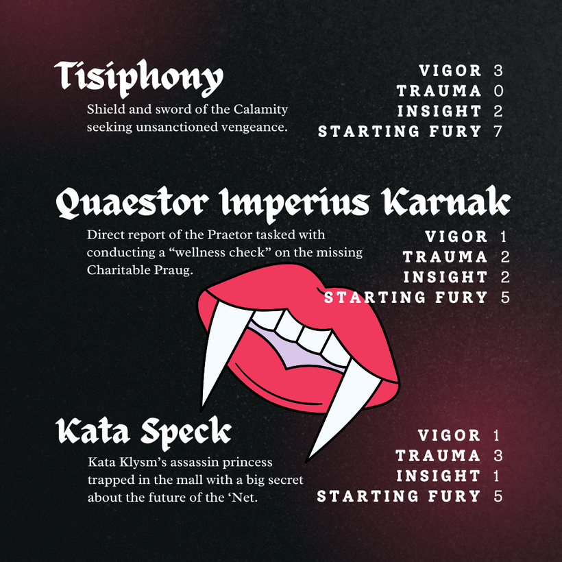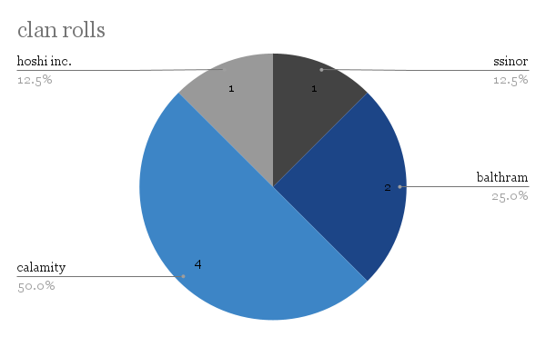 the results from the clans table might be the funniest one to me, because there ARE six possible results. calamity is calamity-focused!! i love that this resulted in double agents & internal conspiracies.