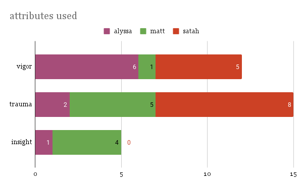 not a bad array if we’d been a team tbh. unsurprisingly, we mostly used what we were good at (whether because of our innate abilities or ummm equipment we stole). shout out to speck for never even once attempting to have insight on a situation.