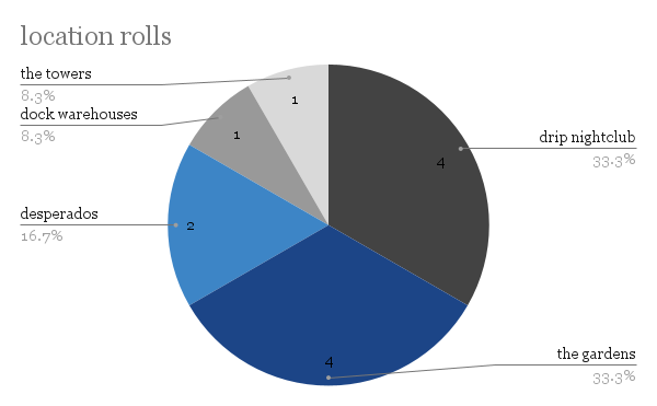 of alyssa’s five book of fate rolls, four were to find a location. three of those gave them the result of “the gardens.” that raises its popularity in the locations table, tying it with “drip nightclub”– the only location all four of us rolled