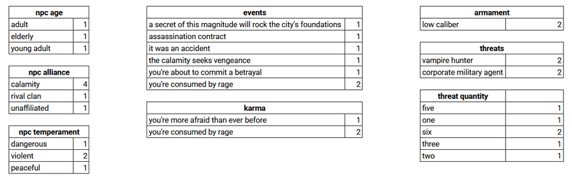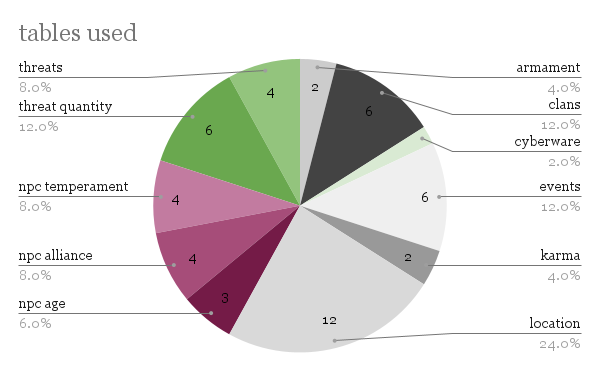 the other ones are a bit too piecemeal to justify the space for their charts but here are some tables– i’m fascinated that we actually rolled every result on the events table & never rolled that there were four of a given threat