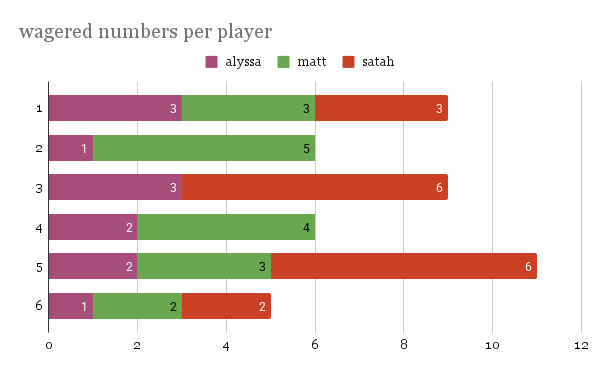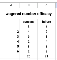 i spent some time calculating which numbers were the most likely to succeed, but it ended up being hampered by the fact that i only have a complete record of the results, not the rolls. as an example, if you wager 3 and 5, then roll just a 5, that’s a success for the 5 but a failure for the 3– but with the data i have, it shows up as a success for both. i didn’t make a chart for it because that makes it pretty meaningless (unlike the rest of this data, OF COURSE), but it looks something like this: