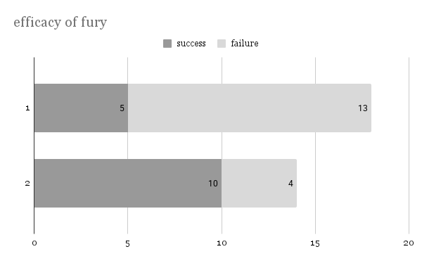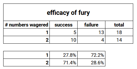 you can spend fury to wager two numbers instead– i don’t have a particularly intuitive grasp of math & statistics so it’s basically magic to me that it fully flips the likelihood of success