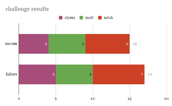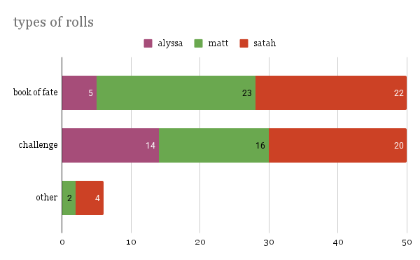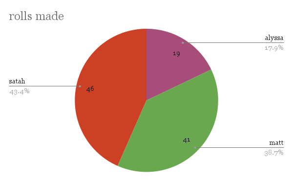 at first i was surprised that matt rolled nearly as much as i did bc i love to roll dice, but then realised that he set himself up to roll three times per log & made eleven of them. our ratios are something like 4.75 rolls per log (alyssa), 3.7 rolls per log (matt), & 9.2 rolls per log (satah), despite me making my final entry into two entries because i’m weird about numbers. i love to roll dice!!