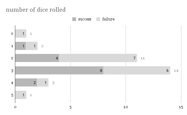 we were mostly rolling two or three dice on challenges, which makes sense given stat arrays. i guess it’s logical that three dice is about when the success/failure rate starts to get pretty even. shout out to the two rolls with the fewest & most dice both being failures