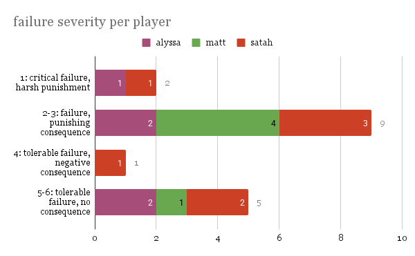 when we did fail, we mostly did… pretty bad! unsurprising that the categories with two rolls were more common, but very funny that the worse one was significantly more frequent, in no small part because of the situations imperius kept finding himself in– sorry buddy