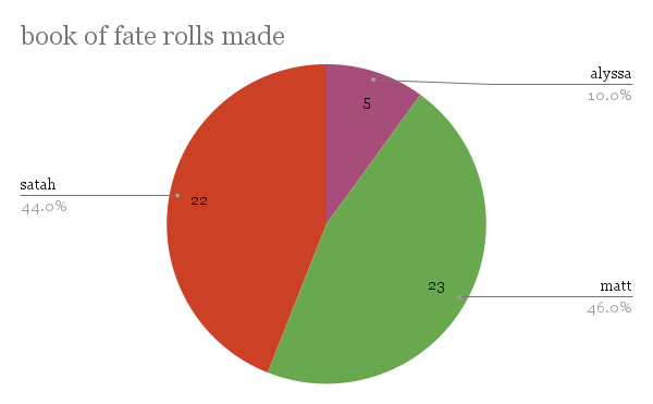 it did genuinely surprise me that matt rolled in the book of fate more than i did bc, you know. i love to roll dice. in part it’s because he fully generated so many NPCs, which takes three or four rolls