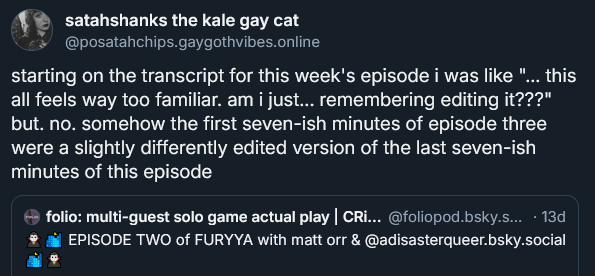 this series took 27 hours to edit. it underwent a lot of rearranging because the open-ended nature of the game made it much more of a puzzle to put together than the majority of the other games on the show, which tend to have very deliberate structures. it was super satisfying & i’m pretty happy with how it ended up, though i think i’m going to take a different approach to this type of game in the future so that i don’t end up having to shift chunks around while working to the extent that stuff like this happens, where i accidentally started the third episode with the ending of the second episode,
