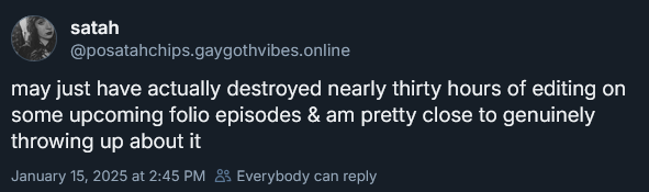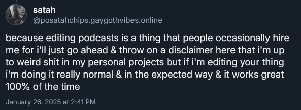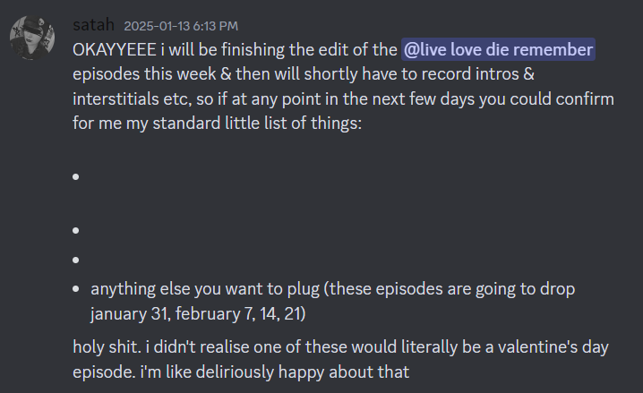 why did i censor the bullet points? it’s not a secret. it’s literally just like “the exact name & pronouns you want to be credited by & any social media links”. i don’t know why i’d have to hide that. like oooh no-one can know that i do the bare minimum of being respectful as a podcast host. gotta keep that locked up. in case i want to be sooo mysterious about specifically this