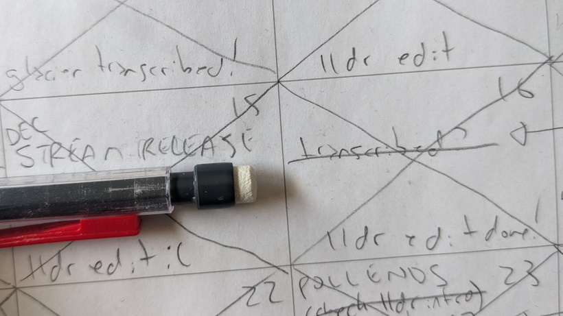 i have a dedicated physical calendar for folio to track deadlines & when i worked on things & whatever & the tiny addition of the sad face marking these events REALLY cracks me up (pencil carefully censoring spoilers for the next series):