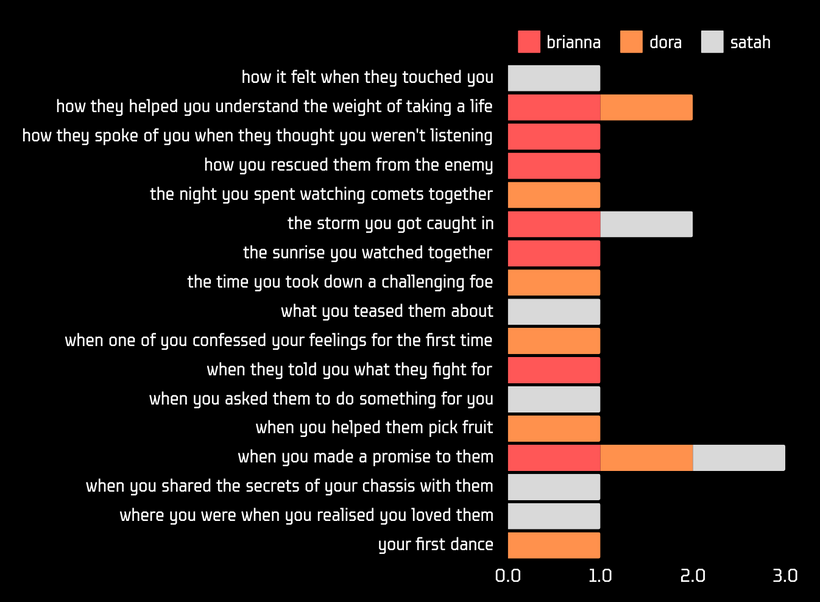 most of the memory prompts were only given to one specific player, with the only prompt given to all three of us being “when you made a promise to them”