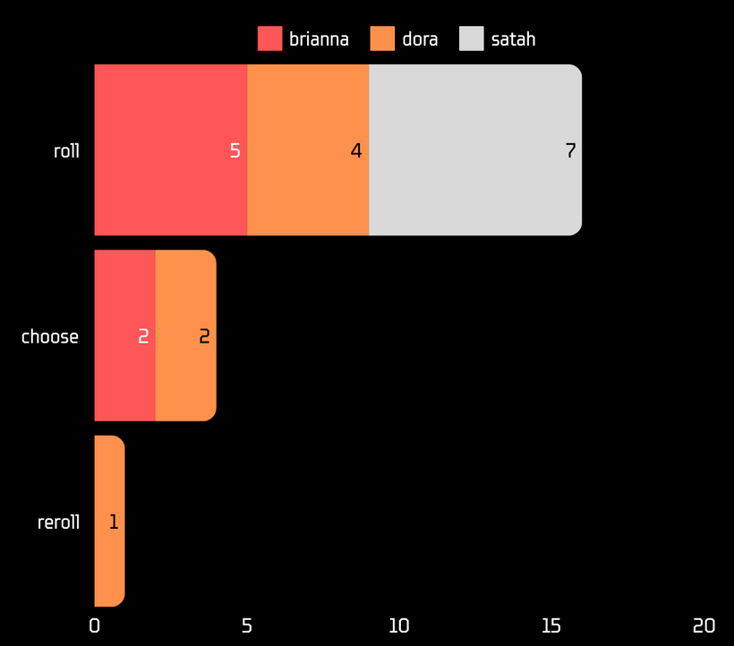 note: “reroll” is defined here as rolling again & taking that exact roll– if there was a reroll then a choice, it was categorised as “choose”
